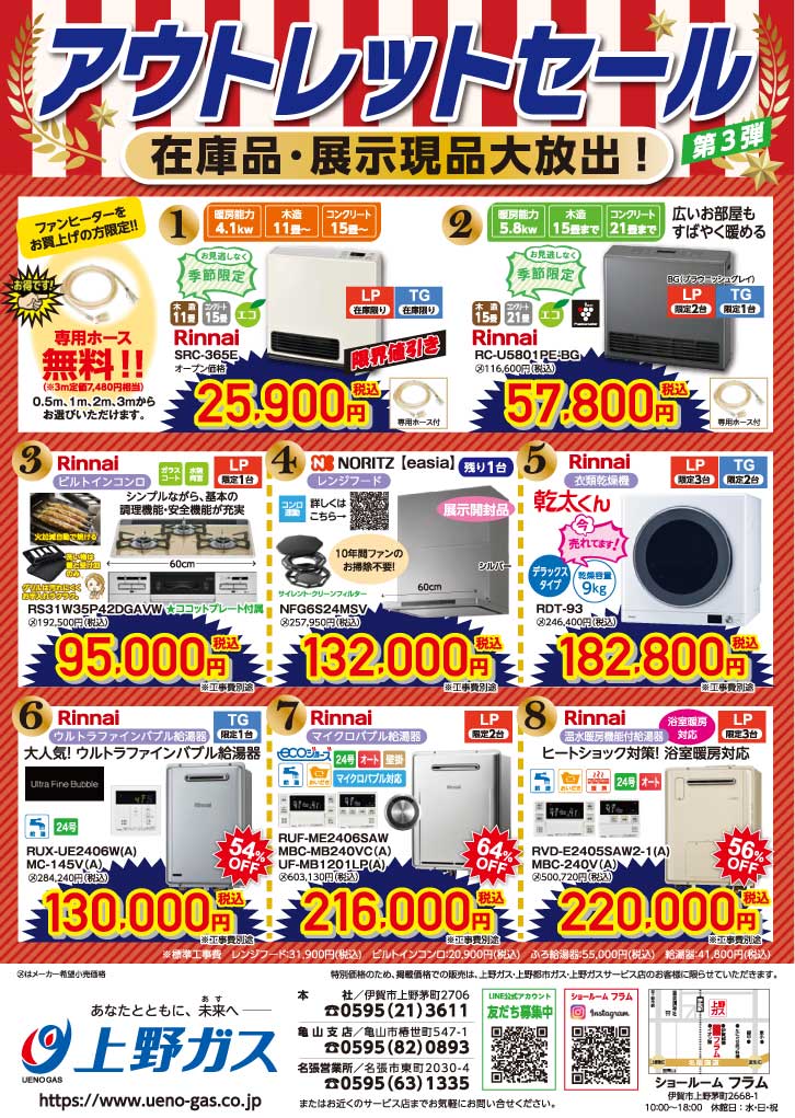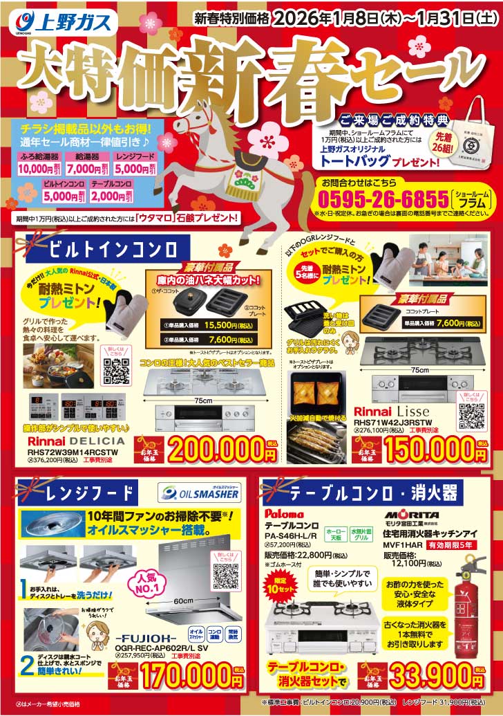 2026年最初のガス機器セールを開催中です。 新年にふさわしい、大特価のガス機器をご用意させていただきました。 また、この季節の必需品、ガスファンヒーターを早くも得値でご提供させていただきます。